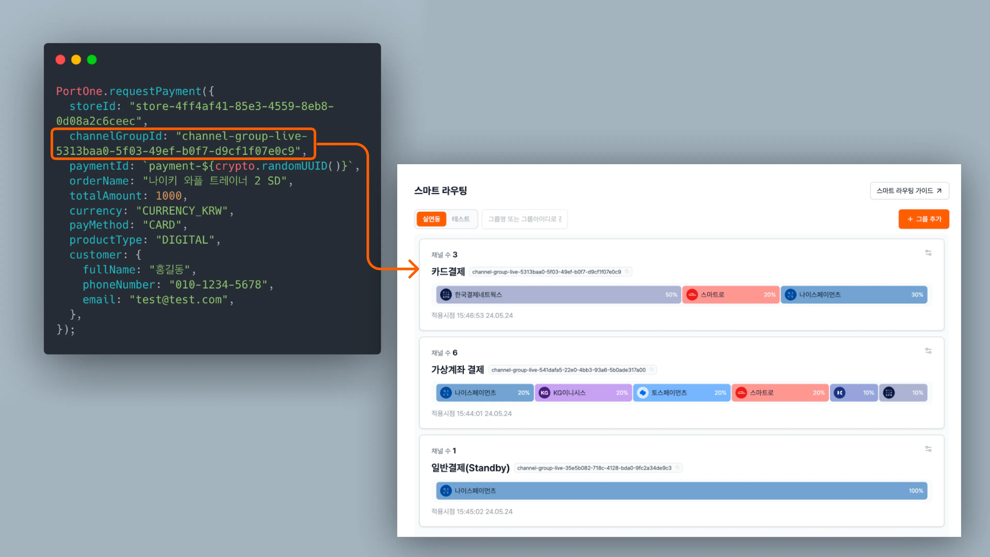 그룹 설정 후 결제 요청 시 channelGroupId 파라미터를 지정하여 호출해야 합니다. 자세한 내용은 스마트 라우팅 연동하기에서 확인할 수 있습니다.