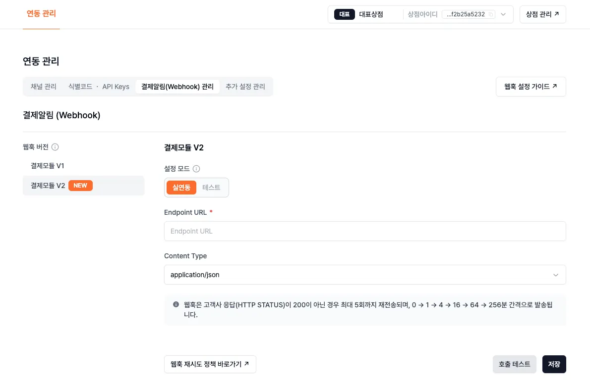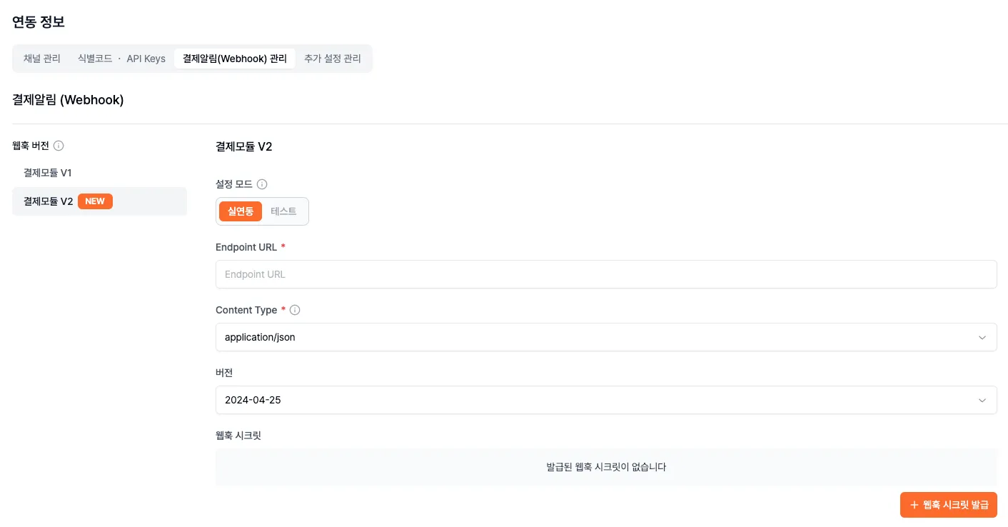 - [웹훅 버전] 항목에서 [결제모듈 V2] 를 선택합니다.