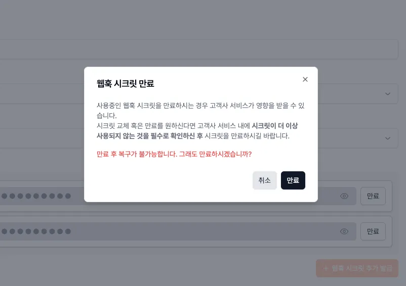 - 우측 하단의 [웹훅 시크릿 발급] 버튼을 클릭합니다.