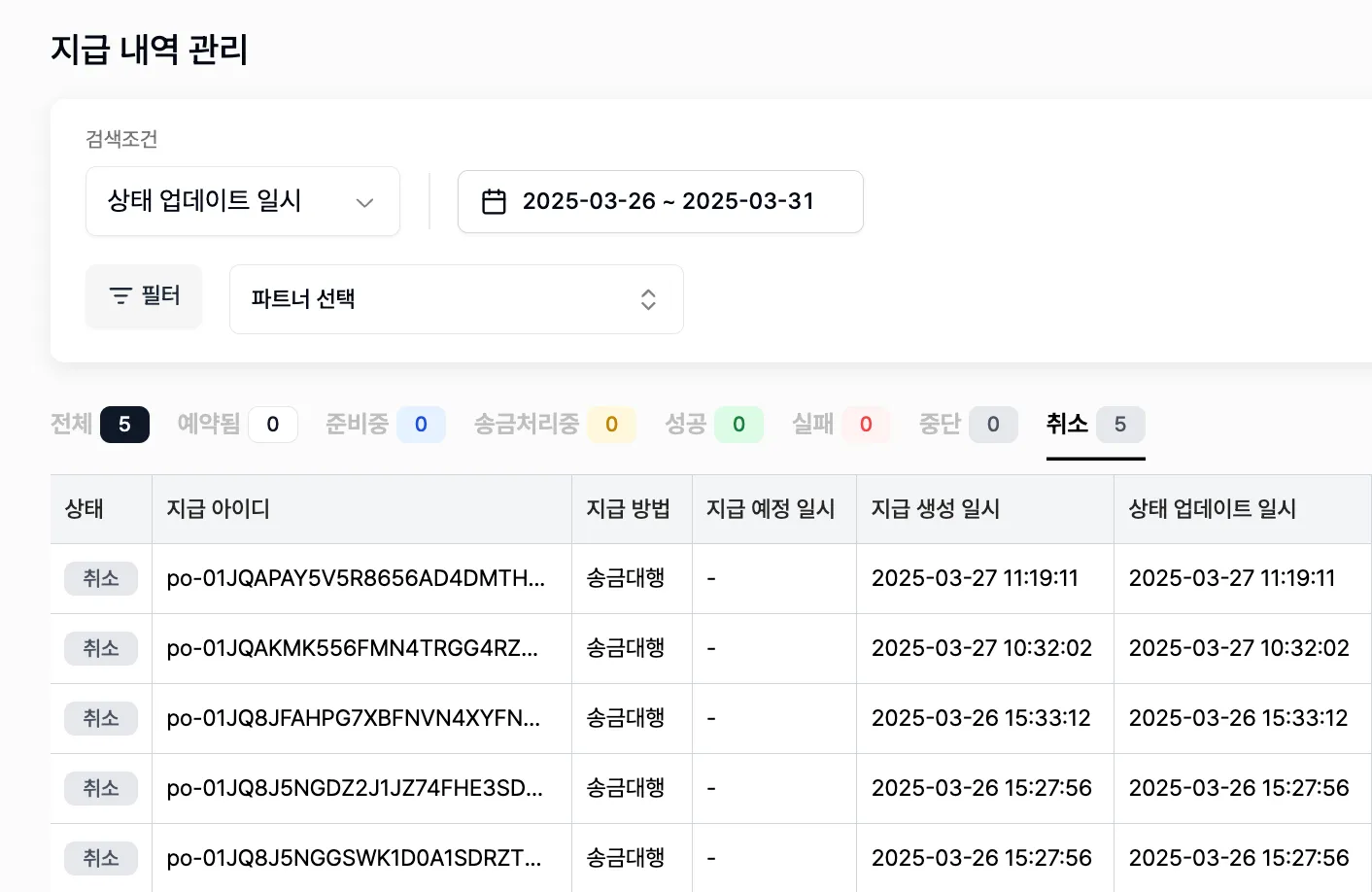 지급 상태 업데이트 일시로 검색조건을 설정하고, 각 상태값을 선택하여 지급상태를 확인할 수 있습니다.