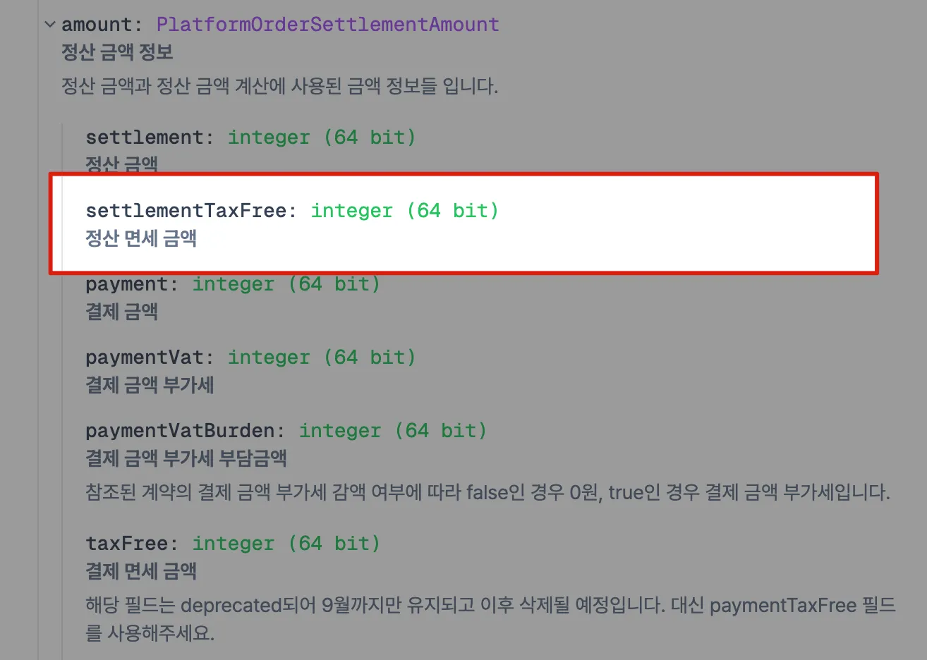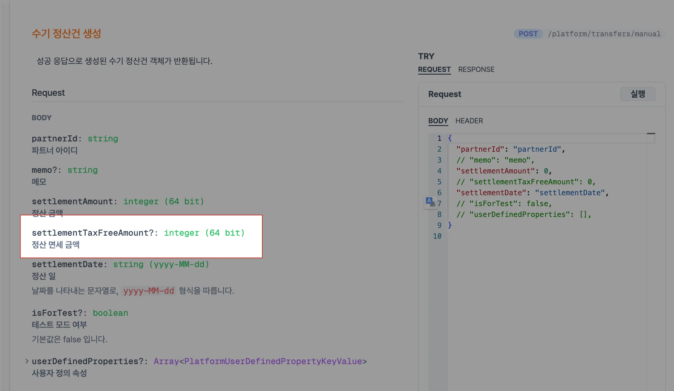 amount.settlementTaxFree - 수기 정산 유형 :